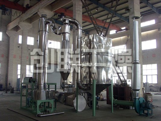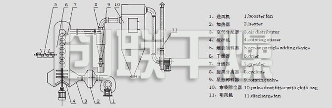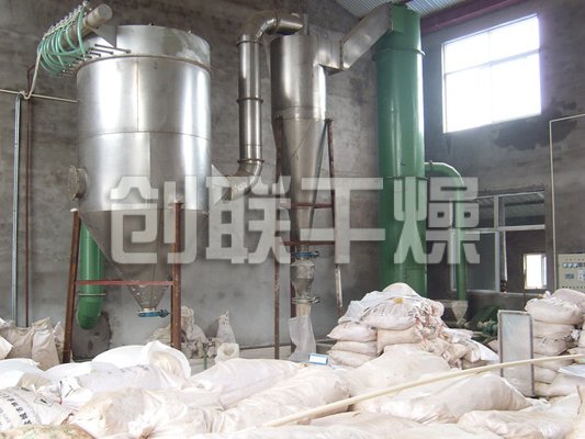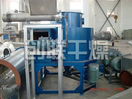 熱空氣切線進入干燥器底部,在攪拌器帶動下形成強有力的旋轉風場。膏狀物料由螺旋加料器進入干燥器內,在高速旋轉攪拌槳的強烈作用下,物料受撞擊、磨擦及剪切力的作用下得到分散,塊狀物料迅速粉碎,與熱空氣充分接觸、受熱、干燥。脫水后的干物料隨熱氣流上升,分級環將大顆粒截留,小顆粒從環中心排出干燥器外,由旋風分離器和除塵器回收,未干透或大塊物料受離心力作用甩向器壁,重新落到底部被粉碎干燥。
