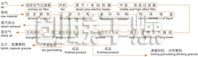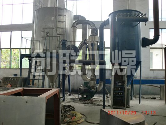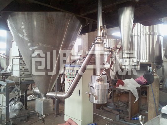 該機采用全封閉形式,所有部件均采用不銹鋼制造,配有三級凈化裝置,過濾后的空氣達十萬級要求。筒體與頂部裝有冷壁裝置,使壁溫<80℃,干燥塔內裝有氣刷掃塔裝置。經該機干燥后的中藥浸膏粉,不會出現焦化變質現象,大大增加了收粉率(95%以上),而且不會產生混藥現象和粘壁現象。