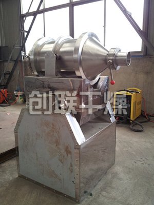 二維混料機主要由轉(zhuǎn)筒、擺動架、機架三大部分構(gòu)成。轉(zhuǎn)筒裝在擺動架上,由四個滾輪支撐并由兩個擋輪對其進行軸向定位,在四個支撐滾輪中,其中兩個傳動輪由轉(zhuǎn)動動力系統(tǒng)拖動使轉(zhuǎn)筒產(chǎn)生轉(zhuǎn)動,擺動架由一組曲柄擺桿機構(gòu)來驅(qū)動,曲柄擺桿機構(gòu)在機架上,擺動架由軸承組件支撐在機架上。